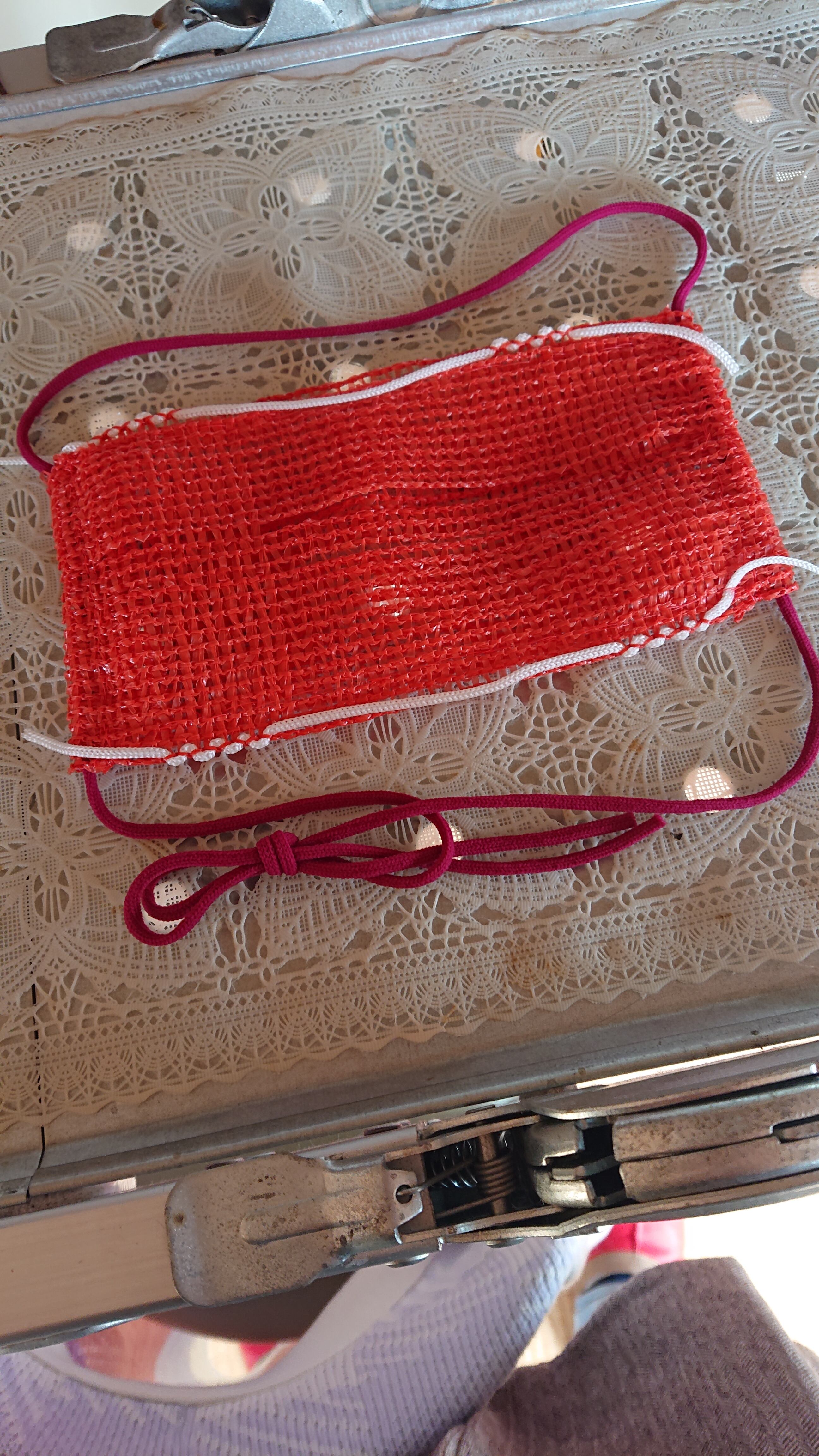 工事現場等の仮の柵の工事柵ネットを防鳥糸で縫ってます。
