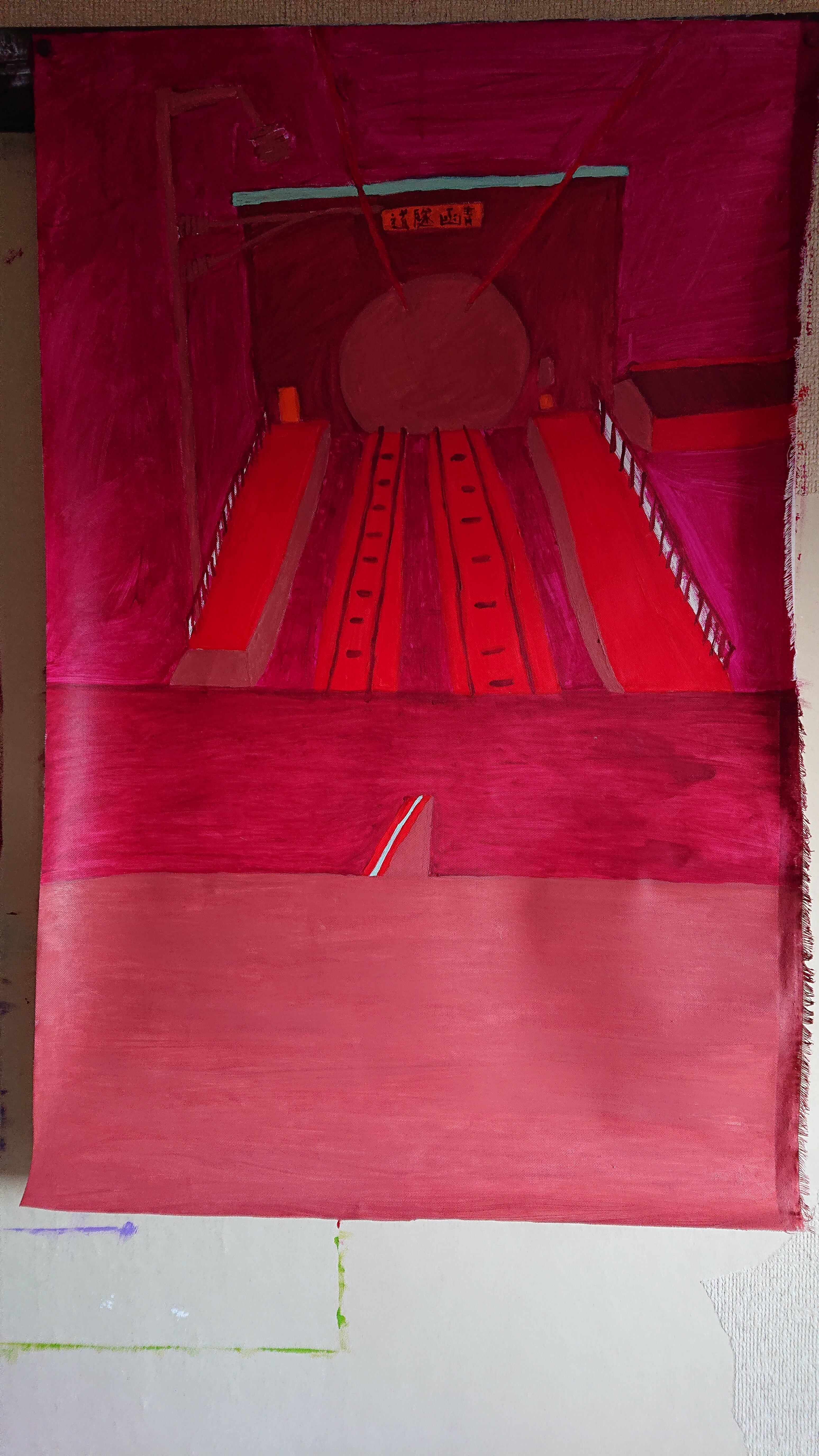 カンバス生地に布用アクリル絵具で書いてます。